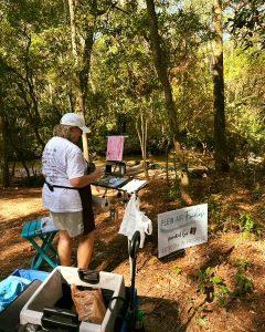 For seven years, ESAC has hosted the event, chaired by Reanna Watson and Adrienne Clow. Together, they arrive by 6:30 am on Day one to stamp hundreds of canvases and dole out much-needed coffee and event details. Artists have traveled from Pennsylvania, Florida, Tennessee, Georgia, Colorado, Louisiana, Mississippi, and from all over the beautiful state of Alabama. Many of the artists they know and love, having worked with them in exhibition and workshops/classes. The new faces are greeted eagerly by staff and other PAF artists. This event allows the staff to share their favorite “secret spots” along Mobile Bay to visiting and local artists.