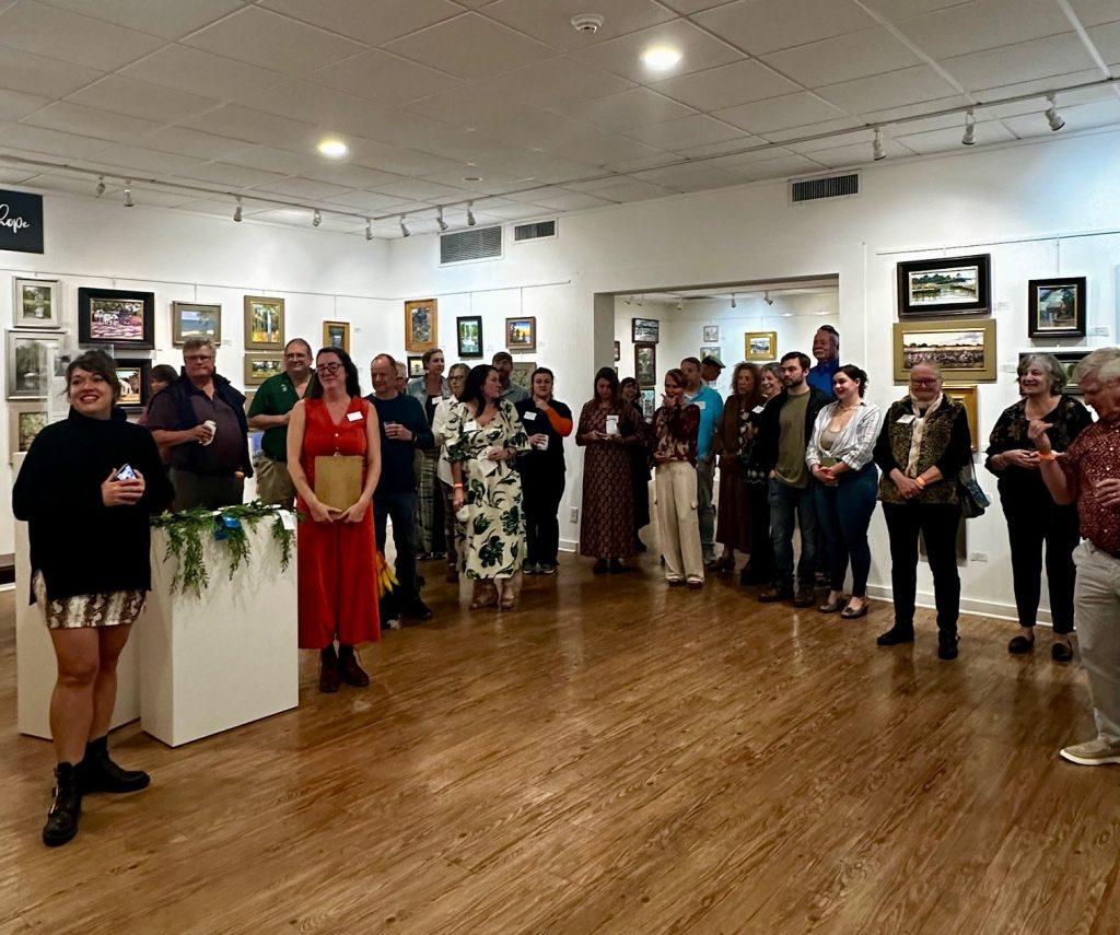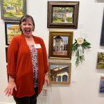 Exhibit work can be hung on the walls until 2 pm, when judging promptly begins. This year’s judge, Karen Philpott, is also a Plein Air painter. This is her second year with PAF, but she is no stranger to Plein Air painting, having painted the hills of Tennessee before making her way to South Alabama. from 4 pm to 5:30 pm, ESAC staff frantically tweaks the show, checking the rods and mounts while Kayla tracks the inventory for labeling and point of sales. It is an “all hands on deck” occasion.